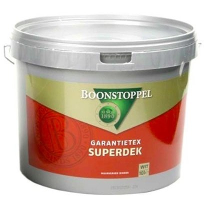 De Boonstoppel Garantietex Superdek is een waterverdunbare muurverf voor binnen. De muurverf heeft een hoge dekkracht. Een verf die uitstekend geschikt is voor plafonds. Wegens kwetsbaarheid beter niet op wanden te gebruiken.