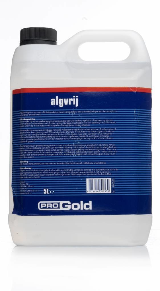 Mengverhouding 250 ml op 10 liter water. Breng ProGold Algvrij in de juiste mengverhouding aan met een spons, borstel of lagedruk spuit en laat het minimaal 18 uur inwerken. Hierna met een hogedrukreiniger met gepaste druk (en eventueel warm water) afspuiten. Afhankelijk van de mate van vervuiling, kan het nodig zijn de behandeling te verhalen. Nadat algen volledig verwijderd zijn en de ondergrond voldoende droog is kan een verflaag aangebracht worden. Voor gebruik tuin en/of vijver afschermen.