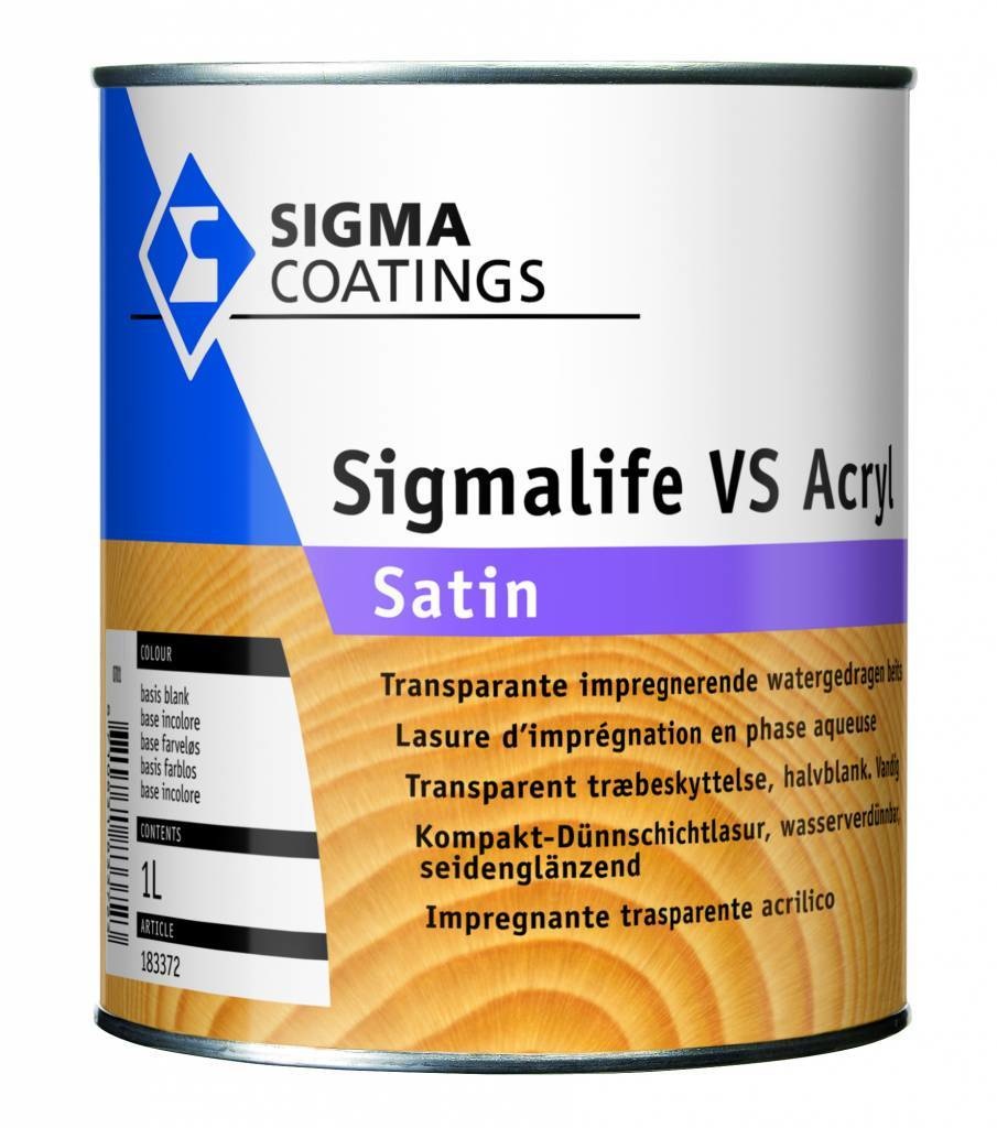 Sigmalife VS Acryl Satin is een watergedragen, zijdeglanzende imrepgneerbeits. Het product is te gebruiken als eerste laag in transparante beitssystemen op nieuw hout of hout waarvan de vergrijsde delen op een mechanische wijze zijn weggeschuurd. Dit product is over te schilderen met transparante beitsen en blanke lakken op basis van watergedragen acrylaat.